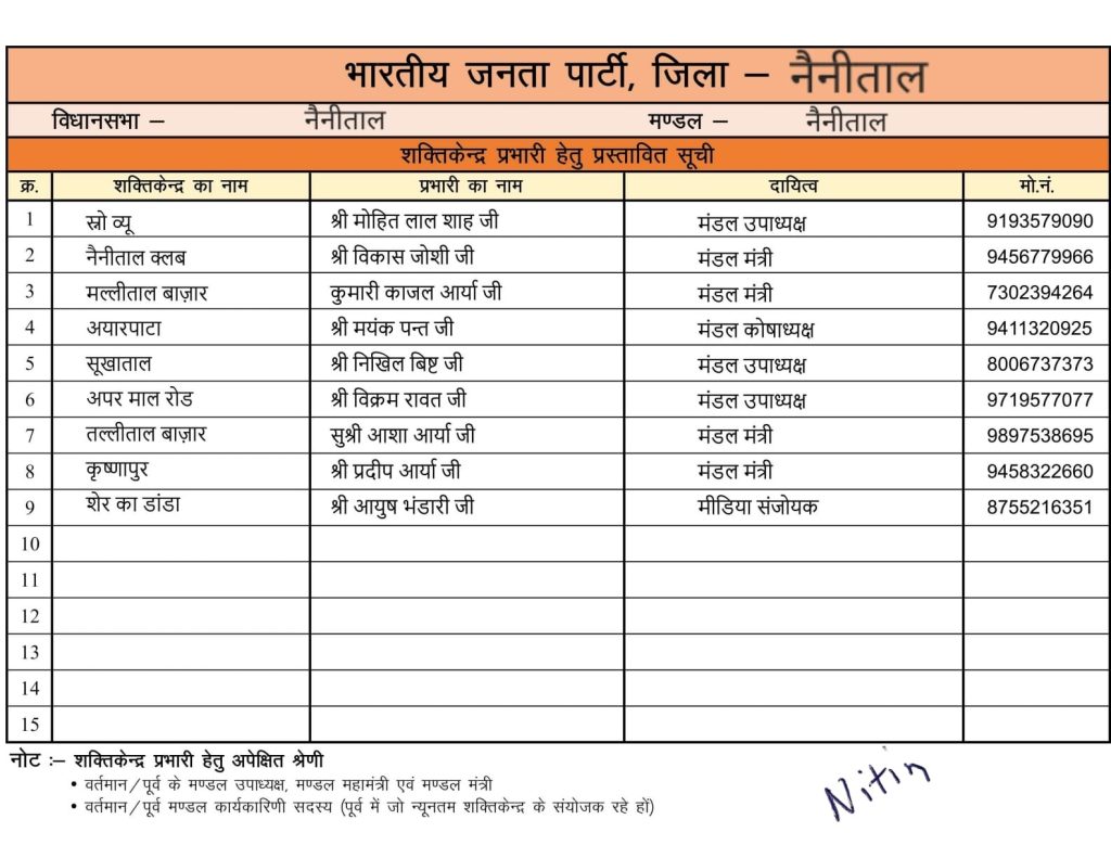 शक्ति प्रभारियों में मोहित शाह को स्नो व्यू, विकास जोशी को नैनीताल क्लब, काजल आर्य को मल्लीताल बाजार, मयंक पंत को अयारपाटा, अखिल बिष्ट को सुखाताल, विक्रम राठौर को अपर माल रोड, आशा आर्य को तल्लीताल बाजार, प्रदीप आर्य को कृष्णापुर, व आयुष भंडारी को शेर का टांडा शक्ति केंद्र का प्रभारी बनाया गया।