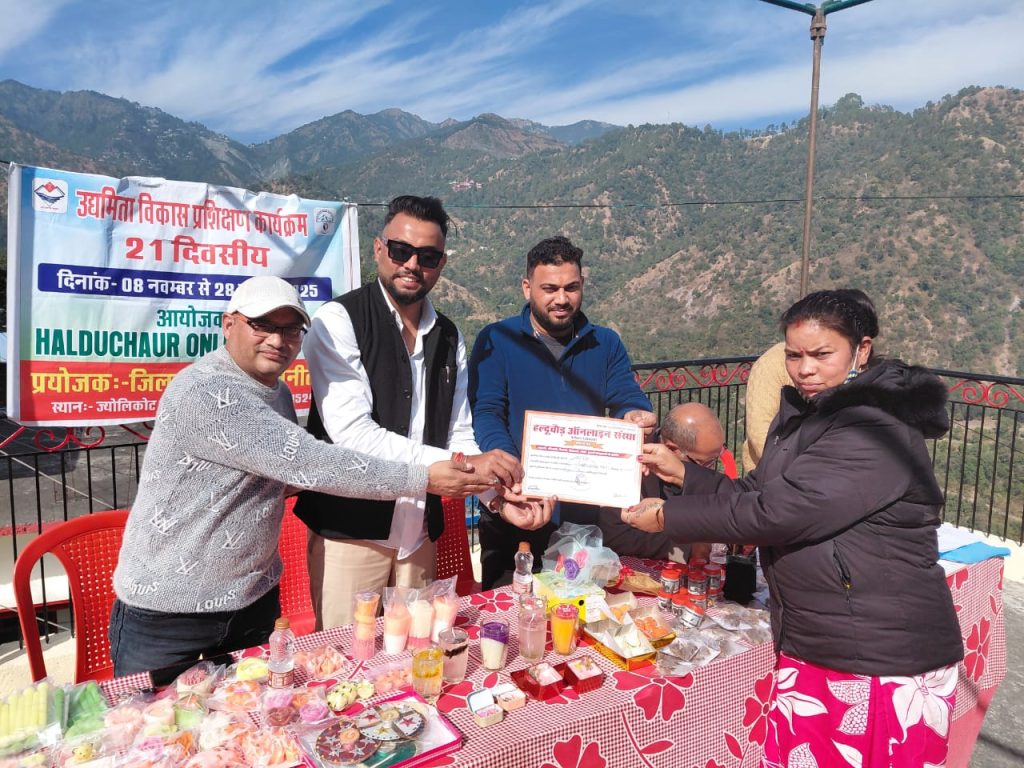ज्योलीकोट, नैनीताल । स्वयंसेवी संस्था हल्दूचौड़ ऑन लाइन द्वारा ज्योलीकोट में आयोजित 21दिवसीय सजावटी मोमबत्ती निर्माण प्रशिक्षण शिविर का समापन ग्राम प्रधान नवल कुमार द्वारा किया गया।