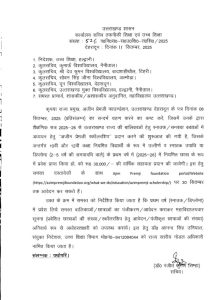 अजीम प्रेमजी फाउण्डेशन की पहल- उत्तराखण्ड देहरादून के पत्र दिनांक 08 सितम्बर, 2025 (प्रतिसंलग्न) का सन्दर्भ ग्रहण करने का कष्ट करें, जिसमें उनके द्वारा शैक्षणिक सत्र 2025-26 से उत्तराखण्ड राज्य की बालिकाओं हेतु स्नातक/ समकक्ष कक्षाओं में अध्ययन हेतु “अजीम प्रेमजी स्कॉलरशिप” प्रदान करने की शुरूआत की गयी है, जिसके अन्तर्गत 10वीं और 12वीं कक्षा नियमित विद्यार्थी के रूप में उत्तीर्ण व स्नातक उपाधि या डिप्लोमा (2-5 वर्ष की समयावधि वाले) के प्रथम वर्ष में (2025-26) में नियमित छात्रा के रूप में प्रवेश प्राप्त किया हो, को रू0 30,000/- की वार्षिक सहायता प्रदान की जायेगी। इस हेतु foundation portal/Website (https://azimpremjifoundation.org/what-we-do/education/azimpremji-scholership/) पर 30 सितम्बर समस्त दस्तावेजों तक आवेदन कर सकते हैं। के साथ Ajim Premji