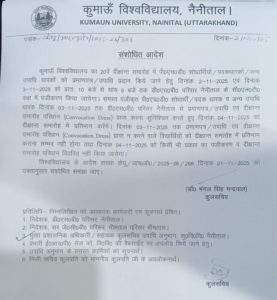 कुमाऊँ विश्वविद्यालय का 20वें दीक्षान्त समारोह में पी०एच०डी० शोधार्थियों / पदकधारकों/अन्य उपाधि धारकों को प्रमाणपत्र/उपाधि प्रदान किये जाने हेतु दिनांक 2-11-2025 एवं दिनाक 3-11-2025 को प्रातः 10 बजे से सांय 6 बजे तक डी०एस०बी० परिसर नैनीताल के सी०एल०टी० कक्ष में पंजीकरण किया जायेगा। समस्त पंजीकृत पी०एच०डी० शोधार्थी / पदक धारक व अन्य उपाधि धारक दिनांक 03-11-2025 तक डी०एस०बी० परिसर नैनीताल से प्रमाणपत्र / उपाधि एवं दीक्षान्त समारोह परिधान (Convocation Dress) प्राप्त करना सुनिश्चित करते हुए दिनांक 04-11-2025 को दीक्षान्त समारोह में प्रतिभाग करेंगे। दिनांक 03-11-2025 तक प्रमाणपत्र / उपाधि एवं दीक्षान्त समारोह परिधान (Convocation Dress) प्राप्त न करने वाले विद्यार्थियों को दीक्षान्त समारोह में प्रतिभाग कराना सम्भव नहीं होगा तथा दिनांक 04-11-2025 को किसी भी प्रकार का पंजीकरण व दीक्षान्त समारोह परिधान वितरित नहीं किया जायेगा।