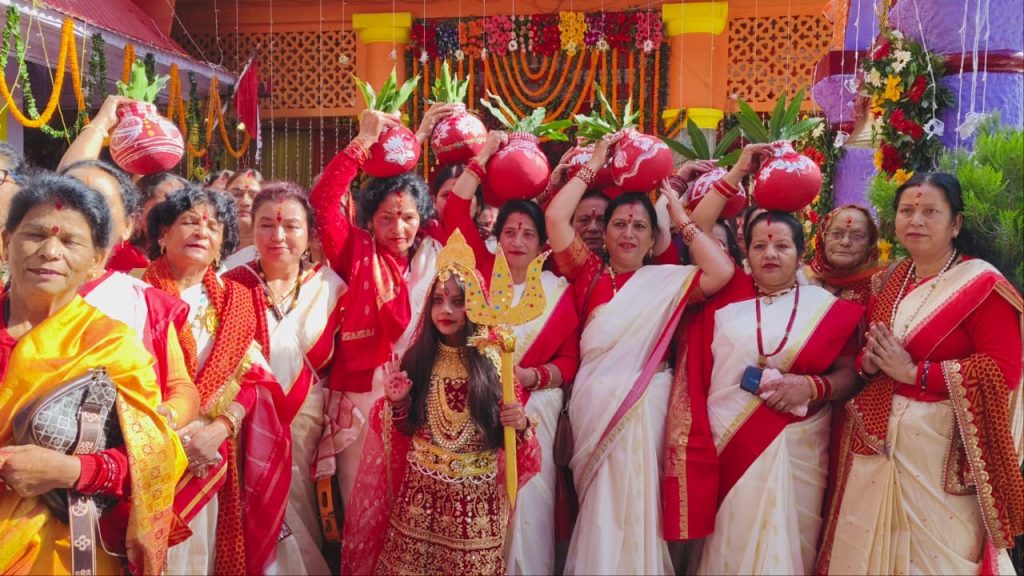 नैनीताल। सर्बजनिन दुर्गा पूजा कमेटी द्वारा आयोजित दुर्गा पूजा महोत्सव का रविवार को भव्य कलश यात्रा के साथ शुभारंभ हुआ । जिसके बाद दोपहर में मल्लीताल फ्लैट में रंगारंग सांस्कृतिक कार्यक्रम हुए । जबकि शाम को नयना देवी मंदिर प्रांगण में मां दुर्गा की मूर्तियों की स्थापना,अधिवास व आरती हुई ।