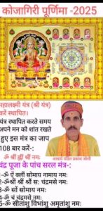कोजागिरी पूर्णिमा पर महालक्ष्मी यंत्र (श्री यंत्र) की स्थापना और पूजा करने से देवी लक्ष्मी प्रसन्न होती हैं और धन, समृद्धि व सुख-समृद्धि प्राप्त होती है। इस पूजा में शुद्ध गंगाजल और पंचामृत से यंत्र का अभिषेक करें, लाल वस्त्र बिछाकर उसे उत्तर-पूर्व दिशा में स्थापित करें और ‘ॐ श्रीं ह्रीं श्रीं नमः’ या ‘ॐ श्रीं ह्रीं श्रीं’ मंत्र का जाप करते हुए मनोकामना पूर्ति के लिए प्रार्थना करें।