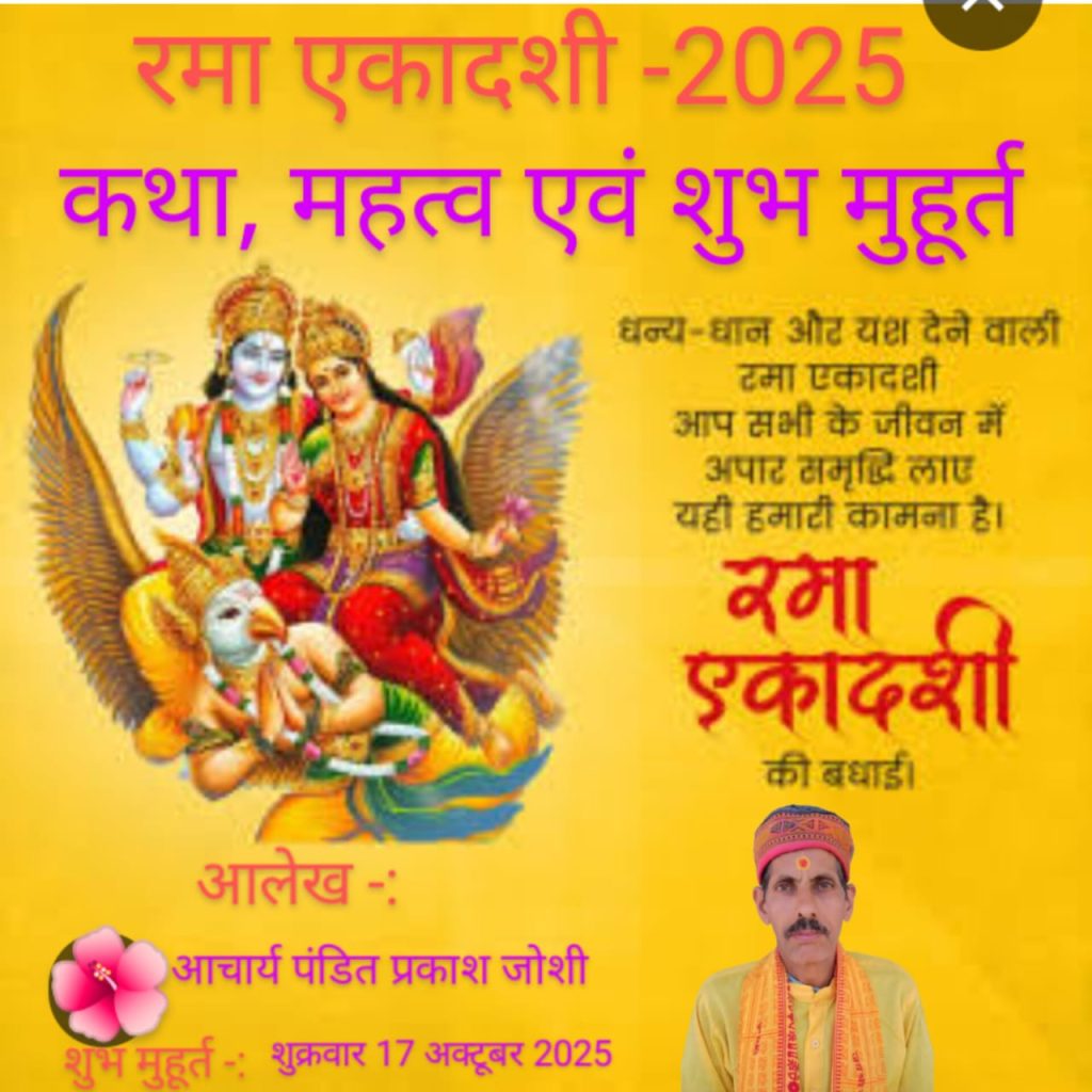 इस बार रमा एकादशी व्रत दिनांक 17 अक्टूबर 2025 दिन शुक्रवार को मनाया जाएगा। इस दिन यदि एकादशी तिथि की बात करें तो 12 घड़ी 15 पल अर्थात प्रातः 11:12 बजे तक एकादशी तिथि रहेगी तदुप्रांत द्वादशी तिथि प्रारंभ होगी अतः इसी दिन गोवत्स द्वादशी पर्व भी मनाया जाएगा। इस दिन मघा नामक नक्षत्र 19 घड़ी सात पल अर्थात दोपहर 1:57 बजे तक है। बालव नामक करण 12 घड़ी 15 पल अर्थात प्रातः 11:12 बजे तक है। यदि इस दिन के चंद्रमा की स्थिति को जानें तो इस दिन चंद्र देव पूर्ण रूपेण सिंह राशि में विराजमान रहेंगे।
