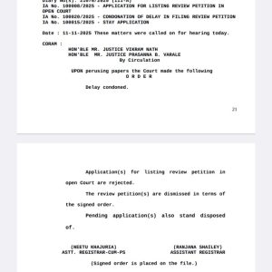 पुनर्विचार याचिका (सिविल) संख्या 1099/2025 के साथ ही, इससे जुड़े कई अन्य मामलों को भी खारिज कर दिया गया। ये सभी मामले समान प्रकृति के थे और इनमें विभिन्न स्पेशल लीव पिटीशन (सिविल) और सिविल अपील से जुड़े फैसलों पर पुनर्विचार की मांग की गई थी, जिनमें डायरी संख्या 742/2025 और कई अन्य डायरी संख्या वाले मामले शामिल हैं।