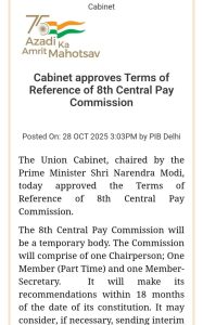 नई दिल्ली: प्रधानमंत्री श्री नरेंद्र मोदी की अध्यक्षता में केंद्रीय मंत्रिमंडल ने 8वें केंद्रीय वेतन आयोग के विचारार्थ विषयों (Terms of Reference – ToR) को मंज़ूरी दे दी है। यह आयोग केंद्रीय कर्मचारियों के वेतन, भत्तों और पेंशन से संबंधित विभिन्न मुद्दों की समीक्षा करेगा।