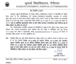 नैनीताल । कुमाऊँ विश्वविद्यालय से सम्बद्ध परिसर / महाविद्यालय / संस्थान के विद्यार्थियों की स्नातक/ स्नातकोत्तर / व्यवसायिक पाठ्यक्रम के अन्तर्गत मुख्य/बैक/एक्स के समस्त विषम सेमेस्टर (तृतीय/पंचम / सप्तम/नवम) के परीक्षा आवेदन पत्र आनलाईन माध्यम से भरे जाने हेतु समर्थ व ई०आर०पी० पोर्टल दिनांक 26-10-2025 से 10-11-2025 तक खोला जा रहा है। उक्त के अतिरिक्त ई०आर०पी० पोर्टल पर बैक परीक्षा (स्नातक / स्नातकोत्तर प्रथम सेमेस्टर) हेतु भी परीक्षा आवेदन पत्र खोला जा रहा है।