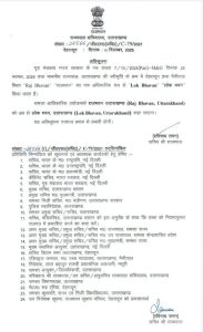 गृह मंत्रालय भारत सरकार के पत्र संख्या 7/10/2025 (Part) – M&G दिनांक 25 नवम्बर, 2025 तथा माननीय राज्यपाल, उत्तराखण्ड की स्वीकृति के क्रम में देहरादून तथा नैनीताल स्थित “Raj Bhavan” “राजभवन” का नाम अधिकारिक रूप से Lok Bhavan” “लोक भवन” किया जाता है।