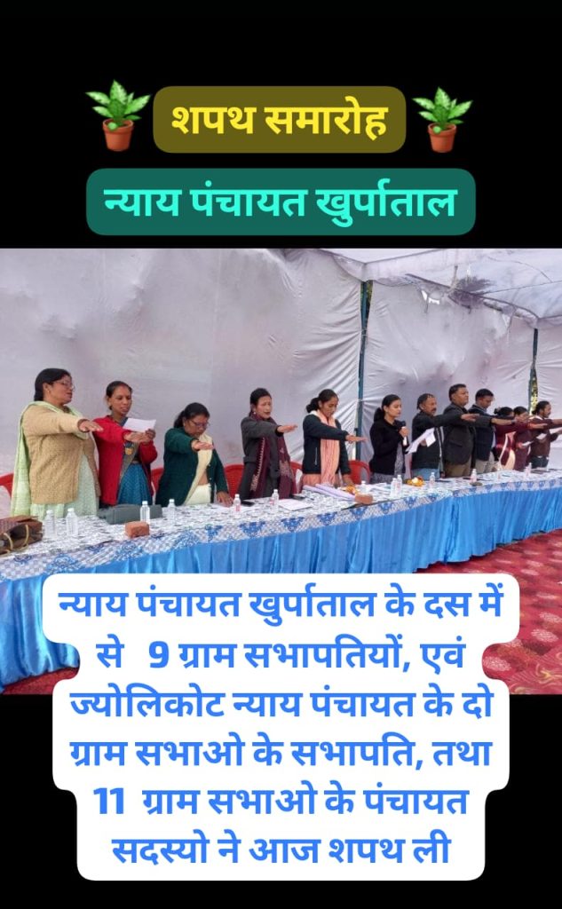 समारोह में न्याय पंचायत खुर्पाताल के 9 ग्राम प्रधानों व न्याय पंचायत ज्योलिकोट के 2 ग्राम प्रधानों व पंचायत सदस्य ने शपथ ली ।